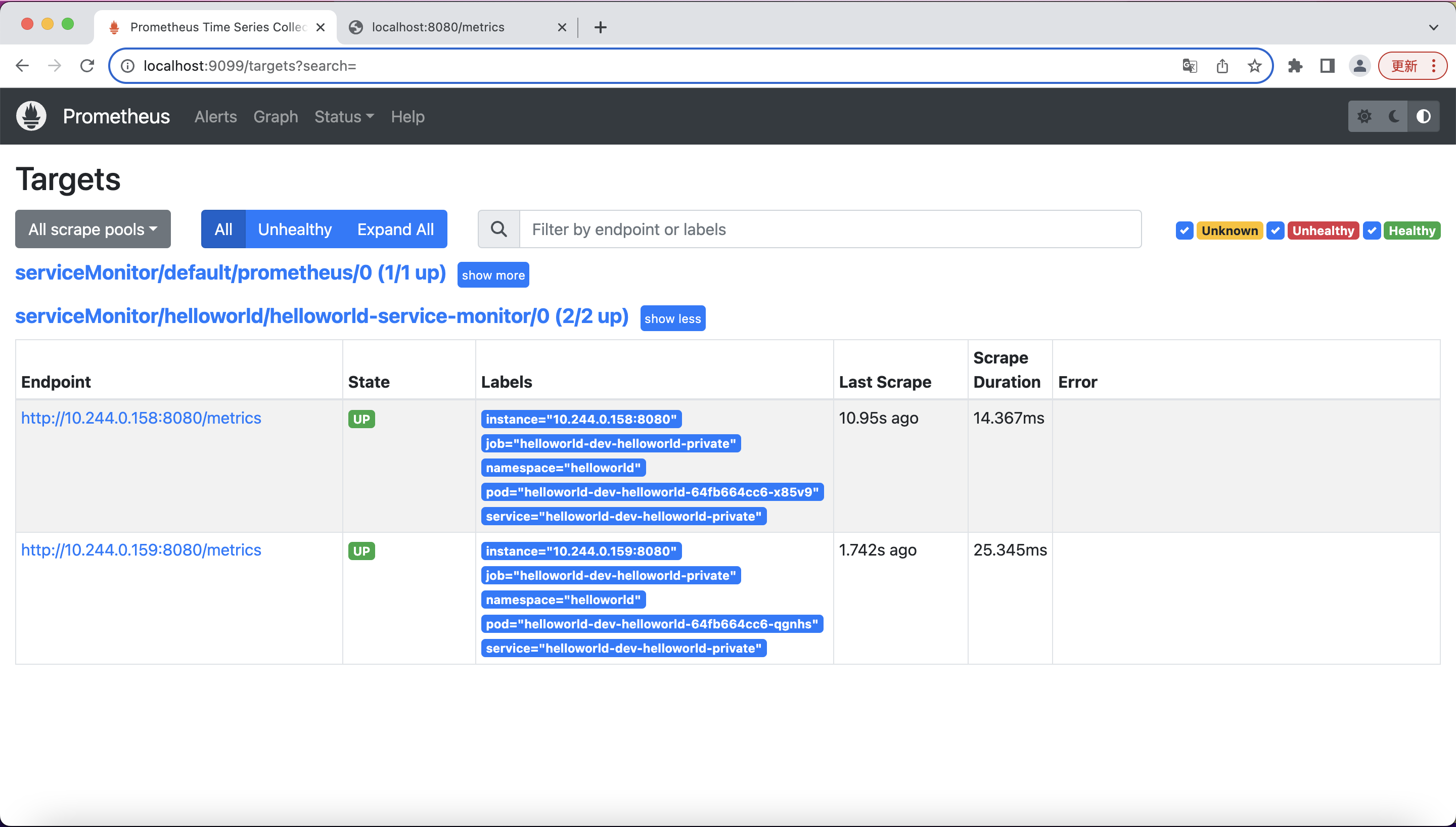 In a few seconds, you should be able to see in the Prometheus portal that the service we just deployed has now been discovered and monitored by Prometheus: